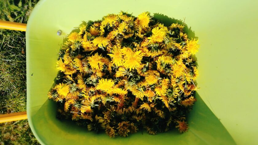 1. Récolter de belles fleurs de pissenlit (C’est la partie trèèès longue). Il en faut un demi seau.